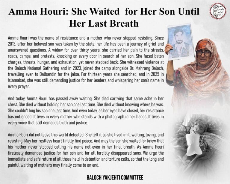 Amma Houri was the name of resistance and a mother who never stopped resisting. Since 2013, after her beloved son was taken by the state, her life has been a journey of grief and unanswered questions. A widow for over thirty years, she carried her pain to the streets, roads, camps, and protests, knocking on every door in search of her son. She faced baton charges, threats, hunger, and exhaustion, yet never stepped back. She witnessed violence at the Baloch National Gathering and in 2023, joined the camp alongside Dr Mahrang Baloch, travelling even to Dalbandin for the jalsa. For thirteen years, she searched, and in 2025, in Islamabad, she was still demanding justice for her leaders and whispering her sonโs name in every prayer.