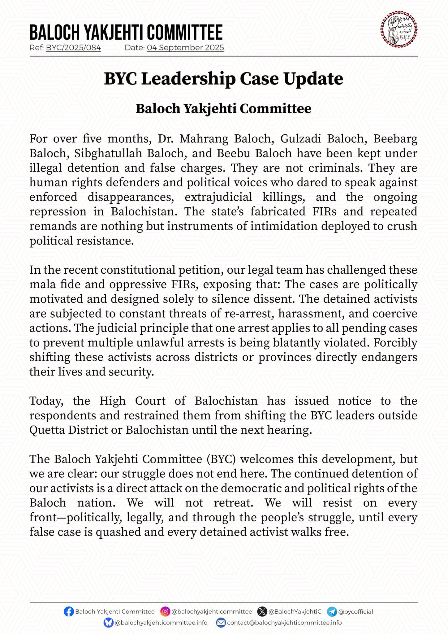The committee’s legal team has challenged these cases in the High Court of Balochistan, arguing that the charges are politically motivated and aimed solely at silencing dissent. The petition highlights threats of re-arrest, harassment, and coercive actions against the activists. BYC also pointed out that the judicial principle limiting one arrest per pending case is being violated, and forcibly shifting detainees across districts or provinces endangers their lives and security.