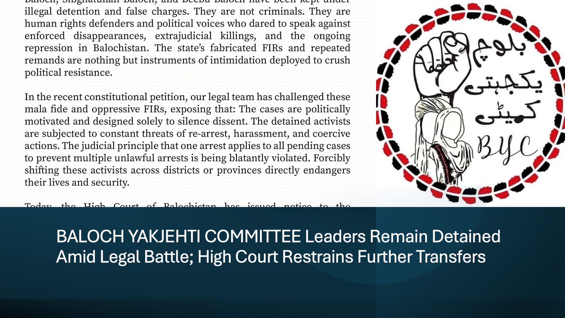 BYC welcomed this judicial development but stressed that the struggle continues. “The continued detention of our activists is a direct attack on the democratic and political rights of the Baloch nation. We will not retreat,” the statement read. The committee affirmed that it will continue resisting through political, legal, and public advocacy until all false cases are quashed and every detained activist is released.