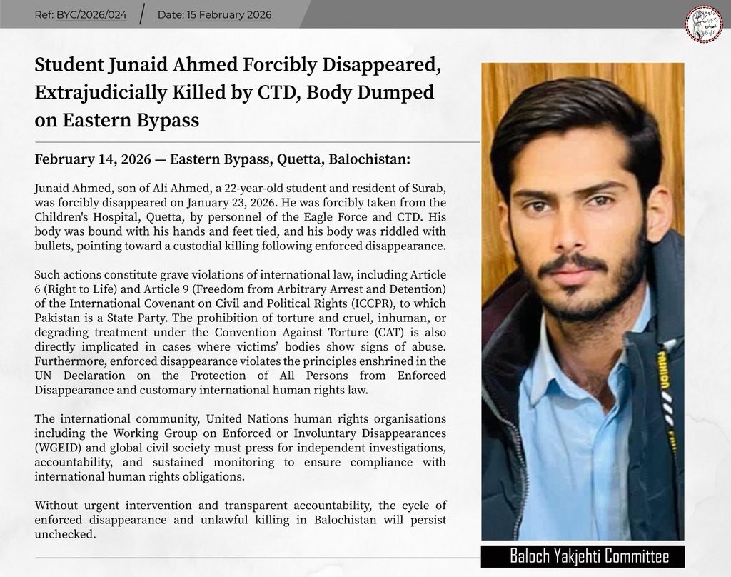 𝙁𝙚𝙗𝙧𝙪𝙖𝙧𝙮 14, 2026 — 𝙀𝙖𝙨𝙩𝙚𝙧𝙣 𝘽𝙮𝙥𝙖𝙨𝙨, 𝙌𝙪𝙚𝙩𝙩𝙖, 𝘽𝙖𝙡𝙤𝙘𝙝𝙞𝙨𝙩𝙖𝙣 Junaid Ahmed, son of Ali Ahmed, a 22-year-old student and resident of Surab, was forcibly disappeared on January 23, 2026. He was forcibly taken from the Children’s Hospital, Quetta, by personnel of the Eagle Force and CTD. His body was bound with his hands and feet tied, and his body was riddled with bullets, pointing toward a custodial killing following enforced disappearance.