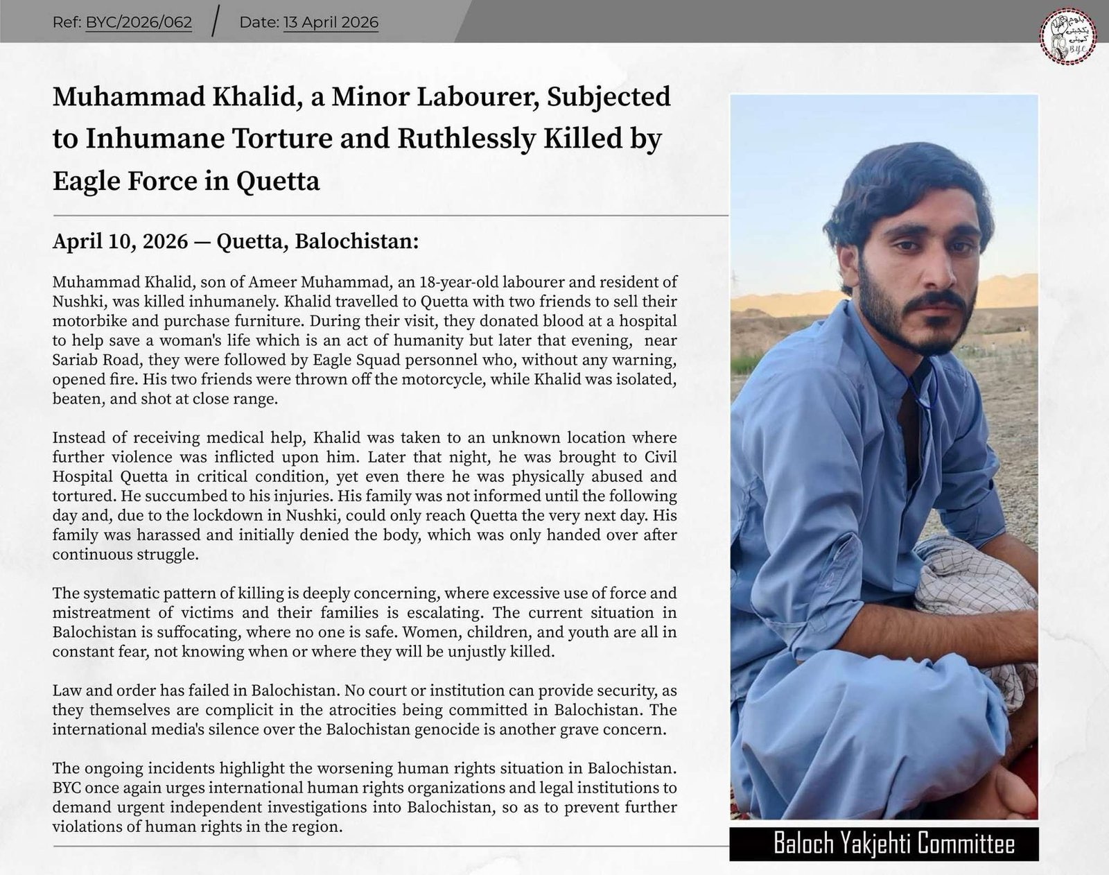 Muhammad Khalid, son of Ameer Muhammad, an 18-year-old labourer and resident of Nushki, was killed inhumanely. Khalid travelled to Quetta with two friends to sell their motorbike and purchase furniture. During their visit, they donated blood at a hospital to help save a woman’s life which is an act of humanity but later that evening, near Sariab Road, they were followed by Eagle Squad personnel who, without any warning, opened fire. His two friends were thrown off the motorcycle, while Khalid was isolated, beaten, and shot at close range.
