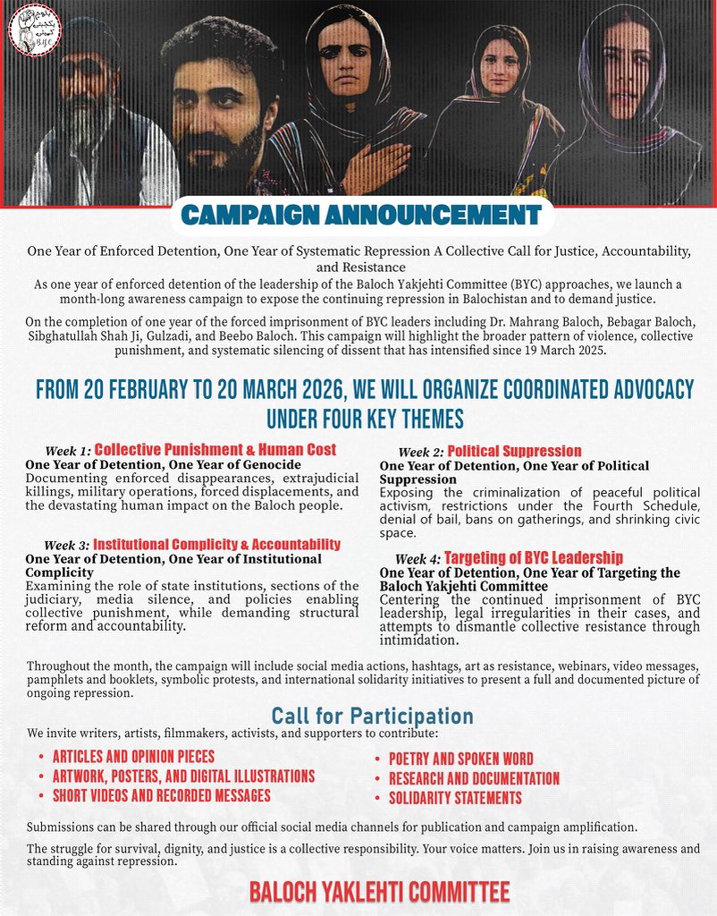 In a statement released this week, the Baloch Yakjehti Committee (BYC) said it would begin coordinated advocacy from 20 February to 20 March 2026 to highlight what it calls a pattern of repression in the region.