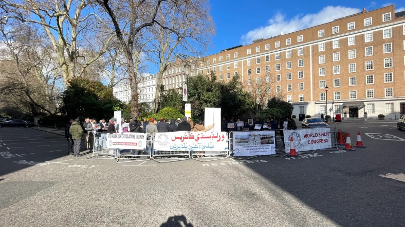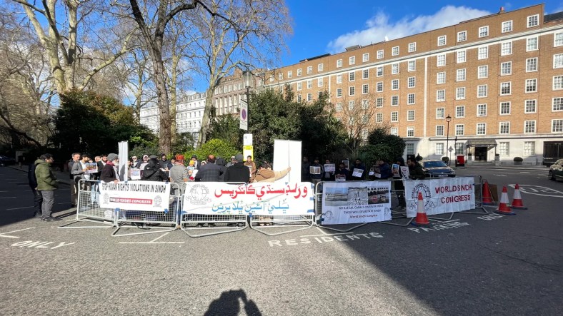 London, 15 March – Marking the International Day of Action for Rivers, the World Sindhi Congress (WSC) staged a large-scale protest outside the Pakistan High Commission in London against the construction of six new canals on the Indus River. The demonstrators condemned the move as unconstitutional, accusing the federal and Punjab governments of Pakistan of attempting to divert Sindh’s water resources. The protest was attended by nationalist leaders, human rights activists, intellectuals, and political workers.